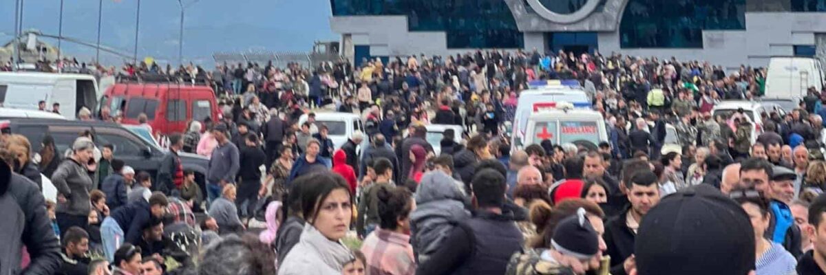 - After shellings began in September 2023, hundreds fled to Stepanakert airport in Nagorno Karabakh – there had not been flights here for 30 years. The people were simply hoping in desperation that some planes would come to evacuate them (Photo credit: Nagorno Karabakh’s Human Rights Defender).